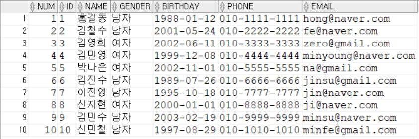이 테이블로부터 ROWNUM(별칭 NUM)을 6부터 10까지의 결과를 아래와 같이 뽑아내게 되는 것이다.