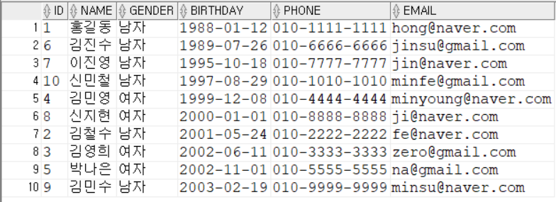 생일을 기준으로 먼저 태어난 순서대로 정렬이 된 것을 확인할 수 있다.