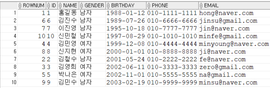 여기서 먼저 태어난 순서대로 정렬을 하고 ROWNUM이 6부터 10까지인 결과만을 구하고 싶다면